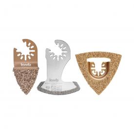 PER SOSTITUIRE E FRESARE FUGHE DI PIASTRELLE DANNEGGIATE E RIMUOVERE I RESIDUI DI COLLA OPPURE PER INTAGLIARE CANALINE DI CAVI NEL CALCESTRUZZO POROSO, NELL´INTONACO E NELLA PIETRA CALCAREA. IL SET È COMPOSTO DA UNA RASPA BILATERALE IN METALLO DURO A FORMA DI DITO DA 35 MM, UNA RASPA DELTA DA 80 MM, UNA LAMA DIAMANTATA PER SEGA DA 57 MM CON RIVESTIMENTO BILATERALE E RISPETTIVAMENTE 9 DISTANZIATORI A CROCE DA 4 MM E DA 5 MM, TUTTI GLI ACCESSORI MULTIFUNZIONALI CON ALLOGGIAMENTO A SOSTITUZIONE RAPIDA.