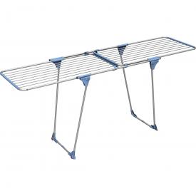 Stendibiancheria da pavimento estensibile con gambe a ponte. 22 metri di stenditura. Gambe in acciaio, telaio e fili in alluminio. Due griglie sovrapposte e scorrevoli fino a 209 cm. Fili grossi in alluminio, che riducono le pieghe sui capi. Sistema di blocco antichiusura sulle gambe e angolari stabilizzanti. Ruote per facilitare lo spostamento. Verniciato bianco, plastiche blu avio. Dim. Aperto (lxpxh) 209x60,5x91 cm. Testato tuv-gs. Prodotto in Italia