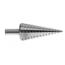 FRESA CONICA A GRADINI IN ACCIAIO HSS PER LA FORATURE ED ALLARGATURA DI LAMIERE DIMENSIONI : DIAM. Ø MIN./MAX 12÷ 20 PROGRESSIONE MM 1, GRADINI N. 9, DIAM GAMBO Ø 10 MM, LUNG. MM 85