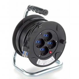 PROLUNGA ELETTRICA CON AVVOLGICAVO 50 MT 4 PRESE POLIVALENTI (SCHUKO + 10/16A) SPINA GRANDE 16A, CON PROTEZIONE, NERO - SEZIONE CAVO 3G1,5 MM²