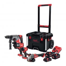 Kit elettroutensili M18 ad alte prestazioni, completo di batterie ad alta capacità e comodo trolley Packout impilabile per il trasporto.